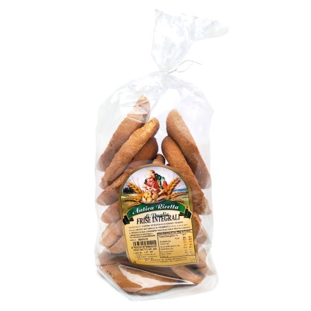 Frise realizzate a mano con Farina integrale di grano tenero. Friselle fragranti e leggere, tipiche di Altamura. confezione: 400 gr ingredienti: Farina integrale di grano tenero “89%”, Lievito naturale di frumento, sale, lievito di birra