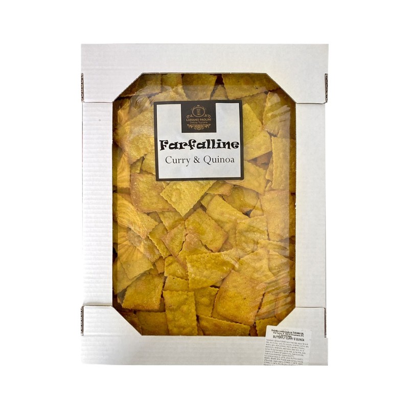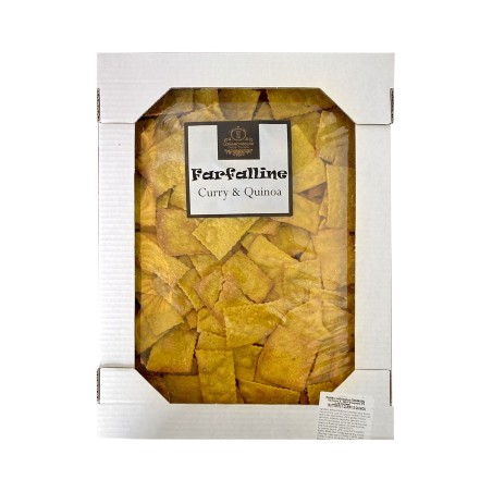 semola di grano duro rimacinata acqua farina di mais olio evo olio di girasole curry 1% (crcuma coriandolo cumino sale zenzero aglio alloro poimento chiodi di garofano finocchio peperoncino cardamomo pepe bianco pepe nero) mix di quinoa 1% (quinoa bianca quinoa ross quinoa nera) aceto balsamico di modena igp (aceto di vino mos5to d uva cotto mosto d uva concentrato contiene solfiti) puo contenere latte uova frutta a guscio sesamo senape soia valori nutrizionali medi 100 g energia 1244Kj 295 kcal grassi 7.5g di cui acidi grassi saturi 1.2 g carboidrati 48 g di cui zuccheri 0.6 g fibre 2.7 g proteine 7.5 g sale 1.3 g