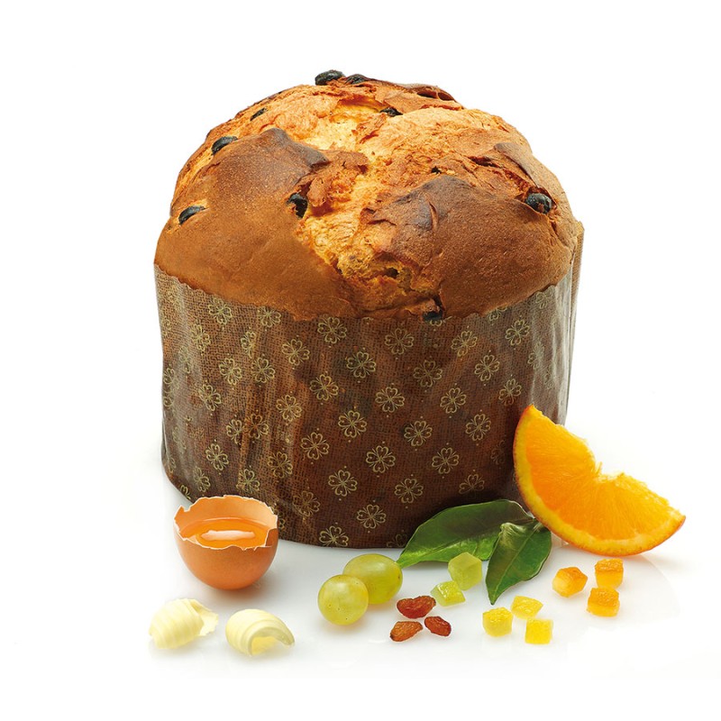 Farina di frumento, Uva sultanina, Burro Zucchero, Tuorlo d’uova fresche, Scorze di arancia candite (scorza di arancia, sciroppo di glucosio-fruttosio, zucchero, correttore di acidità: acido citrico), Lievito naturale (farina di frumento, acqua), Emulsionante: mono e digliceridi degli acidi grassi di origine vegetale, Latte intero in polvere, Burro di cacao, Sale, Estratto di malto d’orzo, Miele, Aromi naturali. Può contenere soia, frutta a guscio e senape.