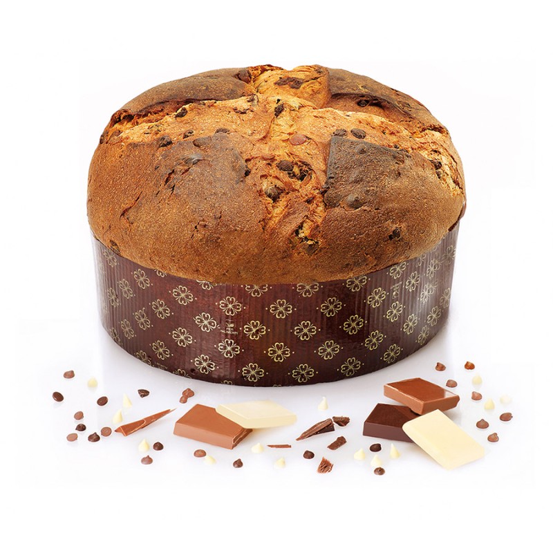 Farina di frumento, Gocce di cioccolato 21% [gocce di cioccolato bianco 8% (zucchero, latte intero in polvere, burro di cacao, emulsionante: lecitina di soia,), gocce di cioccolato al latte 8% (cacao min.26%-zucchero, latte intero in polvere, burro di cacao, pasta di cacao, siero di latte in polvere, emulsionante: lecitina di soia, estratto naturale di vaniglia), gocce di cioccolato fondente 5% (cacao min.43%-zucchero, pasta di cacao, burro di cacao, emulsionante lecitina di soia], Burro (latte), Tuorlo d'uova fresche cat. A da allevamento a terra, Zucchero, Scorze di arancia candite in pasta (scorze di arancia, sciroppo di glucosio-fruttosio, zucchero), Lievito madre (farina di frumento, acqua), Sciroppo di zucchero invertito, Emulsionante: mono e digliceridi degli acidi grassi di origine vegetale, Sale iodato, Aroma naturale di arancia.