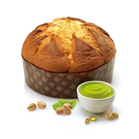 Farina di frumento, Crema Pistacchio 25% (zucchero, acqua, sciroppo di glucosio, olio di semi di girasole, latte magro in polvere, pistacchi 2%, colorante: estratto di spinacio, gelificante: pectina, alcool, aroma, conservante: potassio sorbato), Burro (latte), Tuorlo d’uova fresche cat. A da allevamento a terra, Zucchero, Scorze di arancia candite in pasta (scorze di arancia, sciroppo di glucosio-fruttosio, zucchero), Lievito madre (farina di frumento, acqua), Sciroppo di zucchero invertito, Emulsionante: mono e digliceridi degli acidi grassi di origine vegetale, Sale iodato, Aroma naturale di arancia. Può contenere altra frutta a guscio, arachidi, soia e senape.