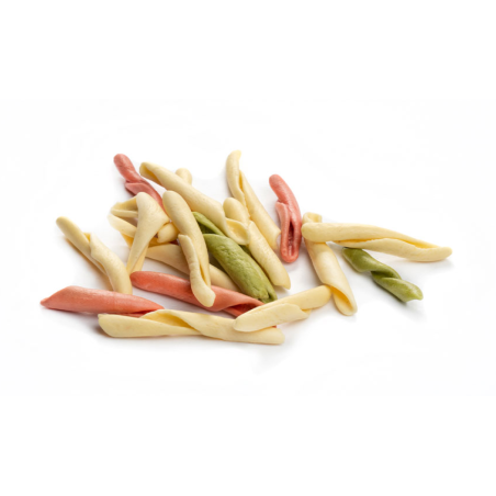 Tris di Strozzapreti in pasta di semola di grano duro. Aspetto ruvido, dal sapore gustoso e tenace. Odore intenso e gradevole. Buona tenuta alla cottura. Pasta artigianale realizzata completamente a mano come da tradizione. Puoi assaporarla insieme alla nostra Passata alla casalinga con Pomodoro 100% Pugliese dal sapore inconfondibile