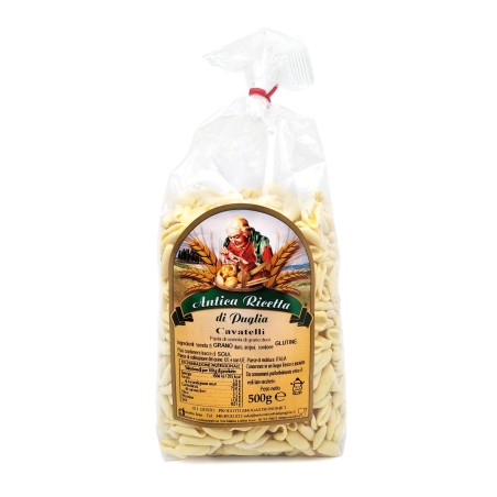 Cavatelli artigianali in pasta di semola di grano duro. Aspetto ruvido, dal sapore gustoso e tenace. Odore intenso e gradevole. Buona tenuta alla cottura.