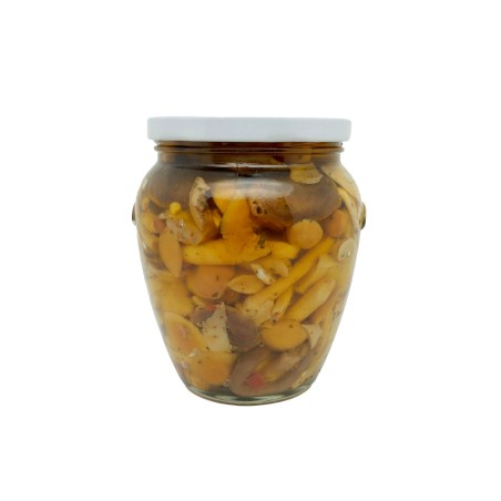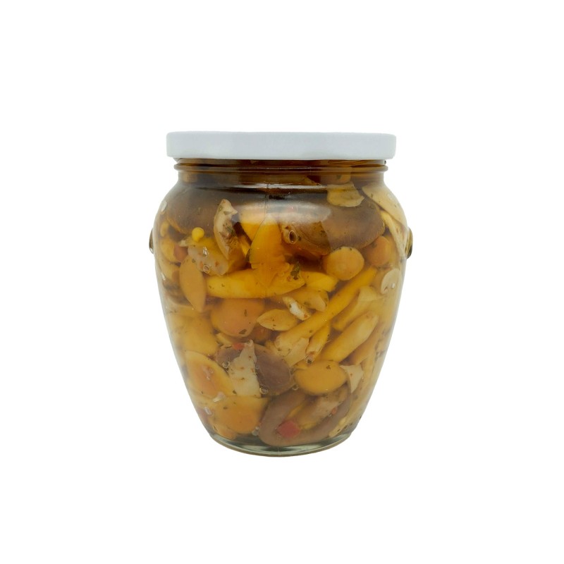 funghi shitake, funghi chapignon, funghi chiodini, olio di semi di girasole, peperoni, aceto di vino bianco, sale, spezie (prezzemolo, aglio, peperoncino) in proporzione variabile, acidificante: E330, antiossidante: E300. allergeni:
