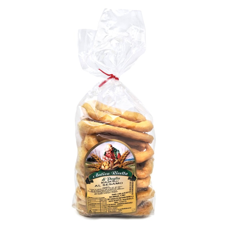 Scaldatelli. Taralli tradizionali pugliesi realizzati a mano con farina di grano tenero “00”, vino bianco e Sesamo. Senza l’utilizzo di conservanti né additivi confezione: 350 gr ingredienti: