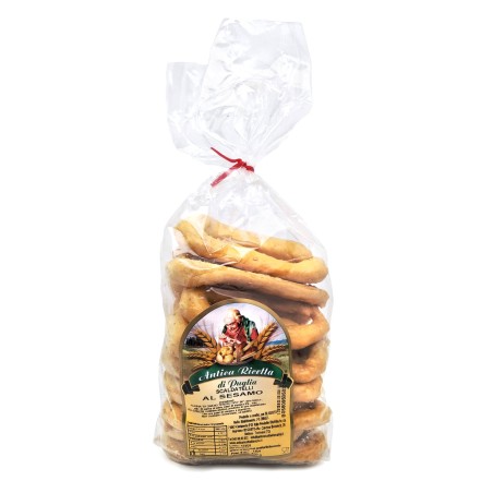 Farina di grano tenero tipo “00”, Olio di sansa di oliva, Vino bianco, Olio extra vergine di oliva, Sale, Semi di Sesamo 10% allergeni: